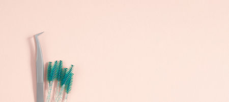 Tools for eyelash extensions and their care. Metal tweezers, eyelash combing brushes, white patches, microbrush, macrobrush and bone.