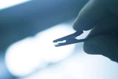 Dentist's hand in latex glove with tweezers on blue background. Medical tools concept.