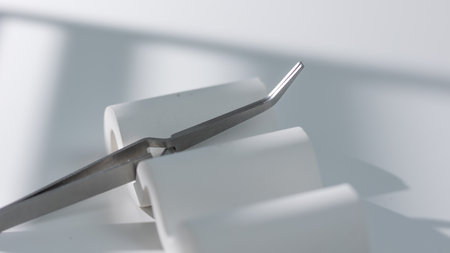 Titanium tweezers isolated on white background. Stainless steel pincers or forceps closeup. Elegant high quality pincette. Lot of small micro screws