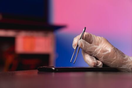 In the hands of a close-up tweezers over the phone. The concept of a European man repairs a smartphone
