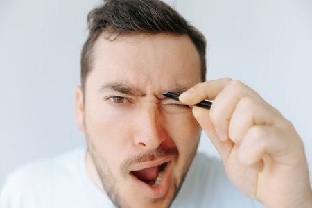 Man focuses on eyebrow grooming with tweezers during self-care routine at home