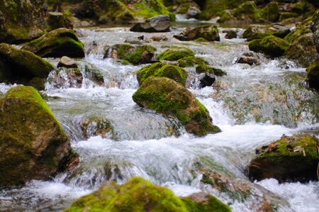 Mountain stream flowing through the forest. Beautiful nature background. Soft focus.