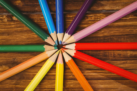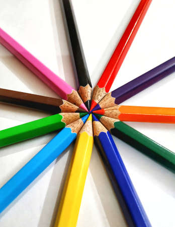 Colorful pencils arranged in a radial pattern