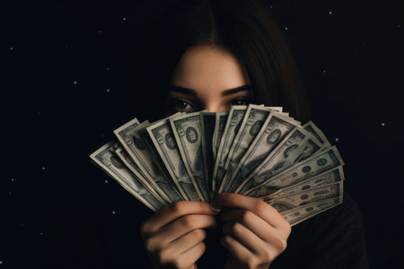 beautiful girl with money in the hands on a dark background, Girl covering her face with money fan close up, no hand deformation, AI Generated