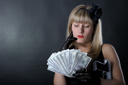 beautiful woman in a black jacket and white shirt looks at the camera with a charming smile, holding many dollars in her hands. Waist up shot on dark gray background, copy space. lady boss, noir