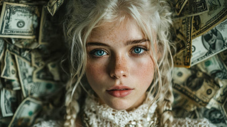 Confident young woman in vintage attire surrounded by flying dollar bills, symbolizing wealth, independence, and luxury.