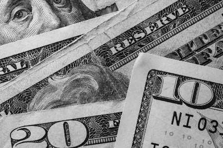 Selective focus on detail of USD banknotes. Close up macro detail of United States Dollars banknotes. World money concept, inflation and economy concept