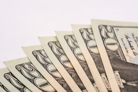 Selective focus on detail of USD banknotes. Counting or giving United States Dollars banknotes. World money concept, inflation and economy concept