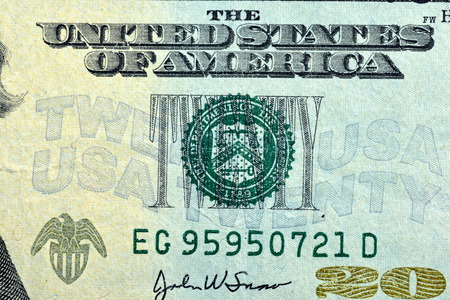 Macro shot with part of 20 US dollars bill. Twenty dollars banknote close up photo with high resolution. Money earnings, payday or tax paying period concept