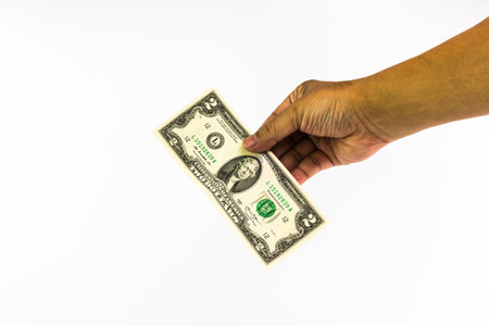 Womans hand holding a two dollar bill. Concept of money, payment, donation, and economy. Financial transaction and American currency.