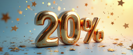 A dazzling golden 20 discount sign stands prominently against a soft gradient background, radiating excitement and celebration. The surrounding shimmering stars and confetti create a festive atmosphere, perfect for promotions and special offers.
