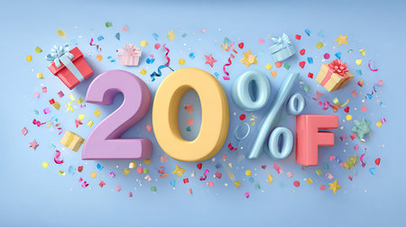 Vibrant 20% OFF 3D text in metallic colors surrounded by floating confetti on a dark background