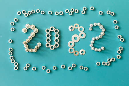 Figures 2020 made of gold Pop rivet nuts ond lochnuts on black tectured chalk board. Long Horizontal banner Fasteners, screws and details. Top view. Christmas and New year concept.