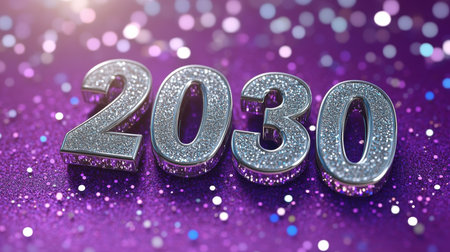 Stunning 2030 Metallic Silver Numbers on a Vibrant Purple Background with Luminous Spheres Effect