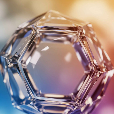 A close-up view of a crystal object with a colorful background