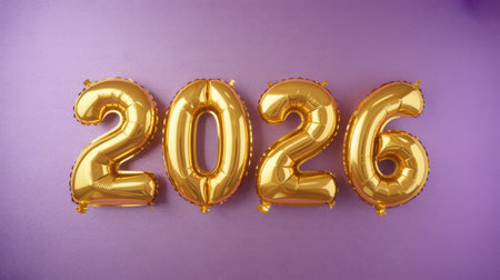 Shiny gold foil balloons in the shape of the numbers 2026 are arranged horizontally against a textured purple background.