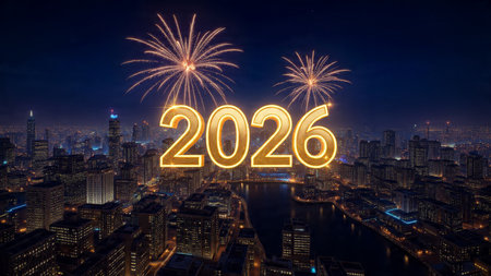Happy new year 2026 written with Sparkle firework and bokeh background