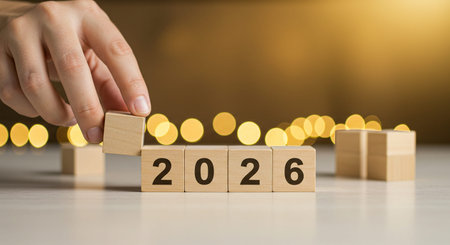 Building towards 2026: A hand places a wooden block to complete the year against a bokeh background, symbolizing future goals.