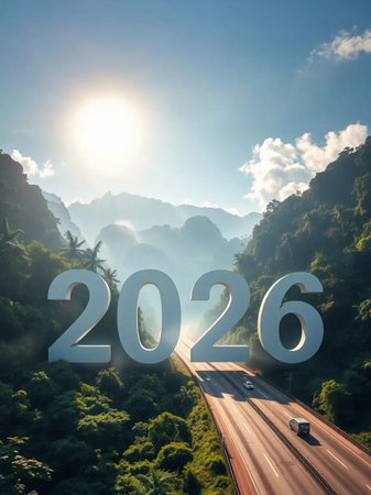 Happy New Year 2026 The number 2026 stands on a highway amidst the mountains in the morning.