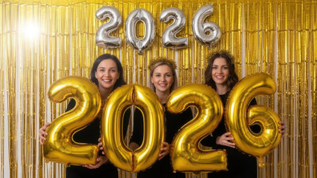 Three cheerful friends hold large golden 2026 balloons against a shiny gold tinsel backdrop. They are smiling and celebrating the upcoming new year together at a festive event.