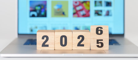 2025 end year to Happy New Year 2026 block against laptop background. Hiring, recruitment, job, Social Media, SEO, Search Engine Optimization and New Year concepts