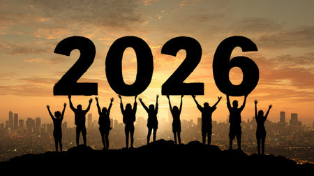 Group of People Silhouetted Against Sunset Holding Up Large Numbers Representing Year 2026 Over City Skyline for Celebration and New Year Themes