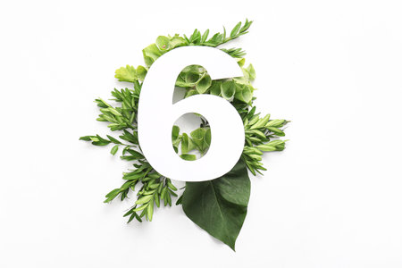Green leaves with paper number six on white background. Top view