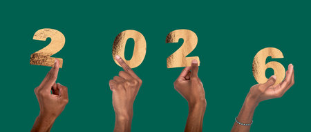 2026 New Year celebration. Dark-skinned male hand raised holding golden metallic numbers with shiny foil texture, festive glowing concept of joy and party. Isolated on white background.