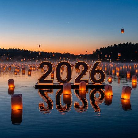 Lanterns in the shape of the number 2026 on the lake at sunset