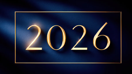 Luxurious golden 3D numbers 2026 with illumination on navy blue textured background within golden frame.