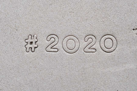 Top view of hashtag sign and number 2020 on wet sand, natural background. Happy New Year 2020!
