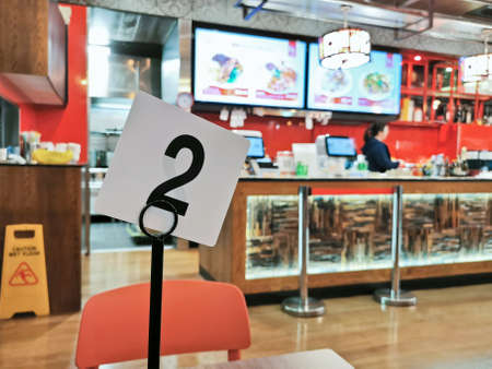 Waiting queue card stands on a table in local cozy Chinese restaurant at night