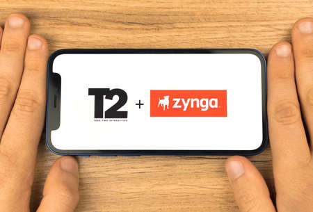 Kharkov, Ukraine - January 12, 2022: Take Two and Zynga logo together. Take-two buy Zynga. Screen with logos, wooden background