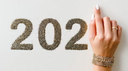 A womans hand with jewelry points to the year 2022, formed by dried herbs, on a plain white surface.