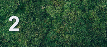 Ecology, zero waste. Green grass and digit two 2. Birthday greeting card. Anniversary concept. Banner. Top view. Copy space. White numeral over eco moss background. Numerical digit.