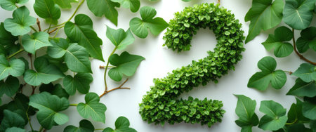A striking number two crafted from rich green foliage stands out against a clean white background, surrounded by an array of lush ivy leaves. This vibrant composition symbolizes growth and renewal, evoking feelings of freshness and vitality in a natural setting.