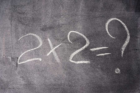 mathematical example two times two is written in white chalk on a black chalk board, close up