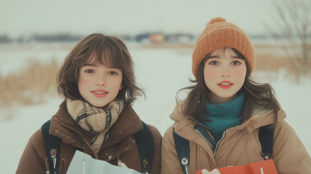 Generative AI : Couple of girls taking a selfie holding a present caucasian and asian people