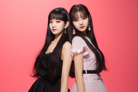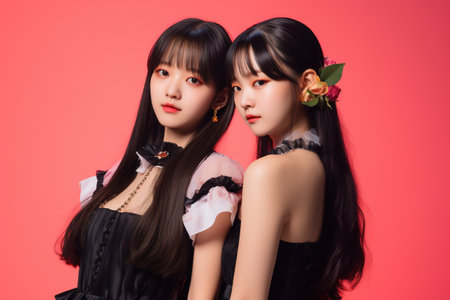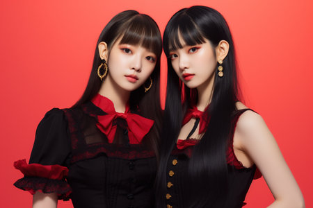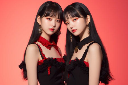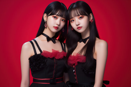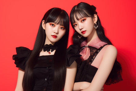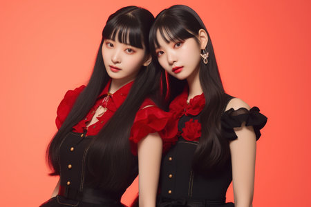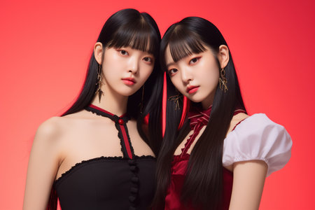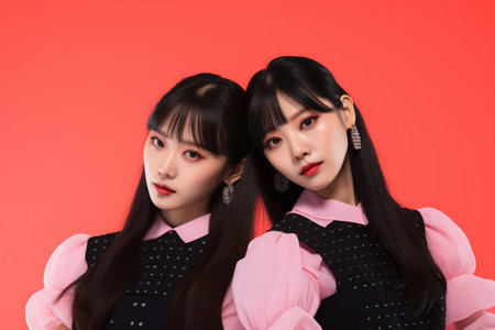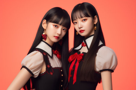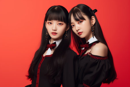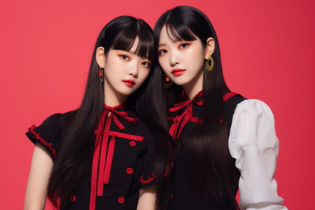 two beautiful asian women in school uniform looking at camera isolated on red background
