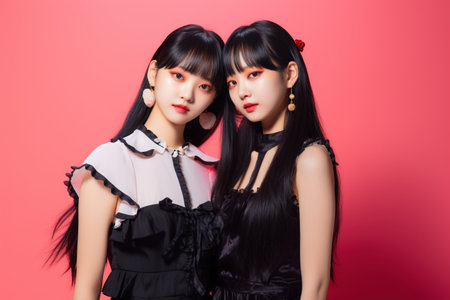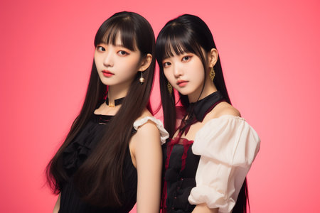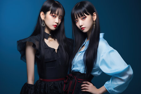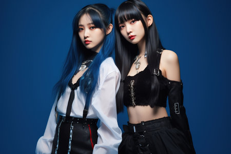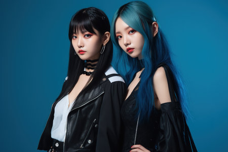Two beautiful asian women in black leather jacket and blue hair on blue background