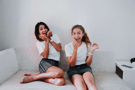 Young group of asian girls friend holding remote control watching TV series show.Beauty cheerful woman teenage sitting