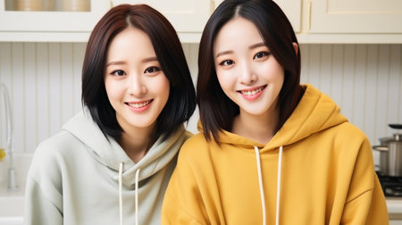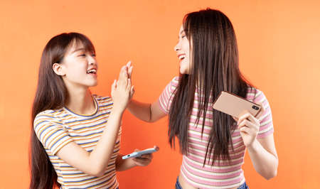 Happy asian girls enjoying time together taking selfies on blurred white background with copy space