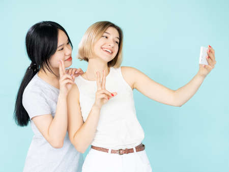 Peace sign. Happy female friends. Enjoying selfie. Ethnic tolerance. Pretty smiling asian caucasian women making photo on smartphone isolated blue copy space.