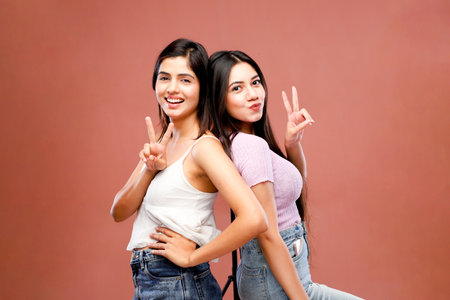 Young beautiful long hair girls sisters twins in casual isolated on the beige background