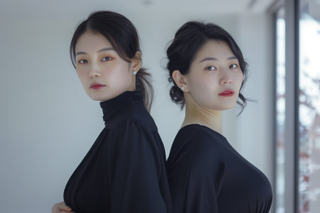 Two women are standing next to each other in black clothing. They are both wearing earrings and one of them has a necklace. Scene is elegant and sophisticated