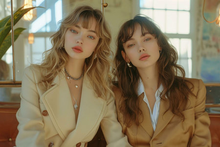 Close-up portrait of two nice-looking cute sweet lovely delicate
