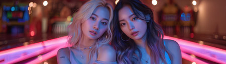 Neon Dreams Two Women in Vibrant Nightclub with Pink and Purple Neon Lights Creating a Futuristic and Energetic Atmosphere for Party Goers and Nightlife Enthusiasts AI Generative
