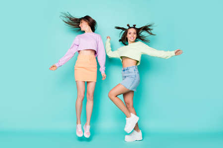 Full body photo of two pretty crazy ladies friends jump up youth clothes rejoicing dancing party wear cropped pullovers mini jeans skirts shoes isolated pastel teal color background