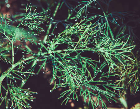 Partially blurred background image of green sprigs of dill growing in vegetable garden. Top view. Copy space