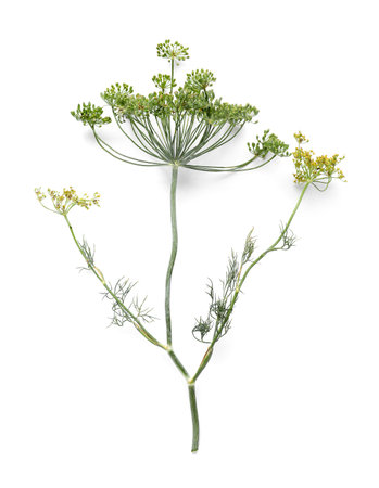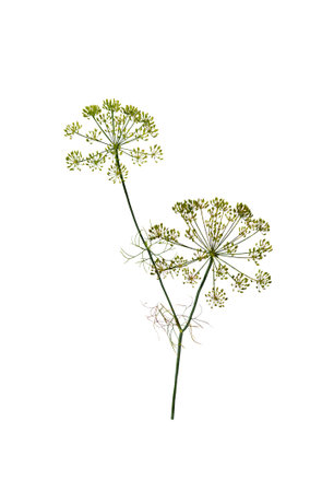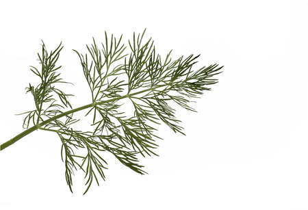 Branch of fresh green dill herb leaves isolated on white background. Flowering plant dill.
